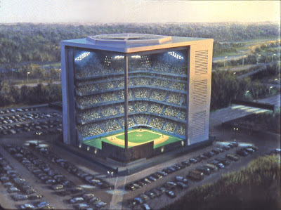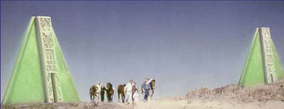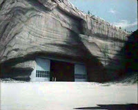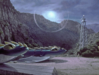 | The Charles Band sci-fi show THE DAY TIME ENDED required several matte shots. The unusual glow from these structures was introduced as a second exposure over the painting. |