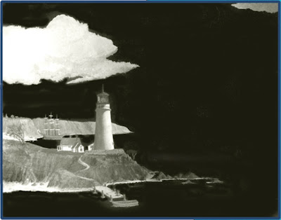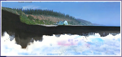 | A very early glass painting Jim made for his proposed version of 20'000 LEAGUES UNDER THE SEA. The glass here is positioned so that a real sky and clouds show through. |