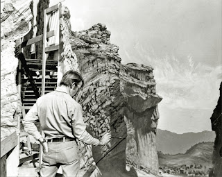 JD: I like your phrase “the join between fact and fiction.” The method of blending depends on the shot. An original-negative matte is usually a soft-focus split. The standard procedure was to run the matte just insideany architectural edges, so that the hard edges of a building could be painted and didn’t need to be followed precisely by the matte. With projection shots, you have several possibilities. Paint strokes can be unconnected daubs of paints near the matte edge, so that areas of the projection can be seen between the paint strokes. Disney seemed to use this approach. I tended to use a razor blade to scratch cross-hatch lines in the paint, allowing some background to show through. In order for this to work, it was necessary to avoid putting a heavy ‘ground’ under the painting. On one occasion, I used very transparent paint. For a scene in which it was necessary to blend a small projected area of miniature flag and sky into a painted sky, I used heavy diffusion on a foreground glass to mix the two sky colors together. I suspect this is similar to what was done in the shot of Gary Cooper standing on top of the building in THE FOUNTAINHEAD.