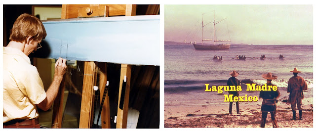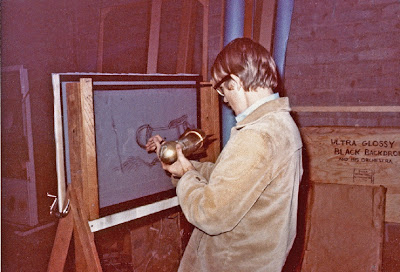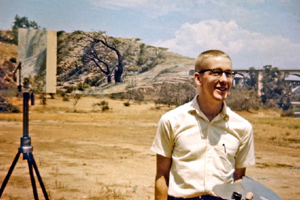 | Jim at work on a foreground painted matte on hardboard for EQUINOX. Jim says he wasn't too happy with this painting, but again, it looks great to me and I'd happily own it. |