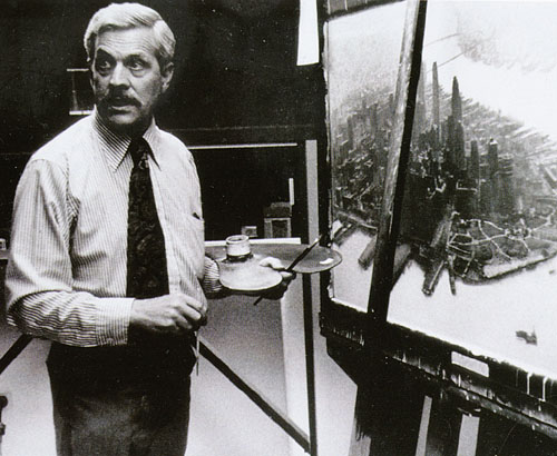 | Hindenburg cruises above New York City, 1937. Actually a large photo blowup of the city with substantial repainting and touching up by Whitlock. The airship is a separate rendering on a foreground glass and is moved frame by frame right to left. Cloud elements also added by bi-pack to compliment the effect. |