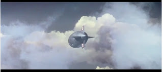 | An example of one of Whitlock's new three dimensional cloud gags, created as I understand it primarily during the making of this film. Bill Taylor would integrate elements of light coloured smoke shot against black velvet and doubled into composite painting vistas. Shadow gag effects as clouds passed by the airship cemented the realism of the shots. |