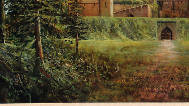 From the early 1950’s Walt Disney had begun to experiment with full live action features in addition to the well loved cartoon shorts and full length animated classics. Several of these, such as the highly successful ROBIN HOOD AND HIS MERRIE MEN (1952) would be based, filmed and completed entirely in England. The highly talented matte artist Peter Ellenshaw had already had his work cut out for him with Disney’s previous, and in fact the first live action adventure, TREASURE ISLAND (1949) and had scores more mattes to paint for the succeeding films that would number near 100 shots all told for the four feature films in total. It was on two of these pictures that Albert Whitlock joined Ellenshaw's department as an assistant. THE SWORD AND THE ROSE (1953) and ROB ROY THE HIGHLAND ROGUE (1954) were Albert’s first introductions to the Disney empire. I know that Al designed and hand lettered the main title 'cast and credits' glasses for both and may have participated in helping Peter with some of the mattes too, though I have no firm evidence.