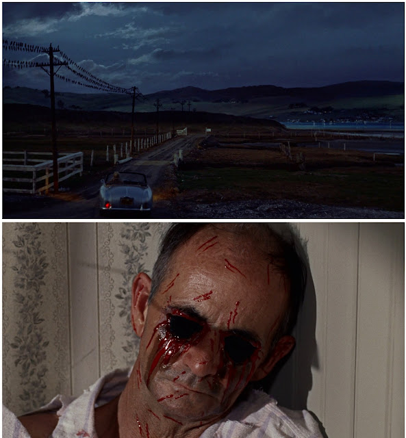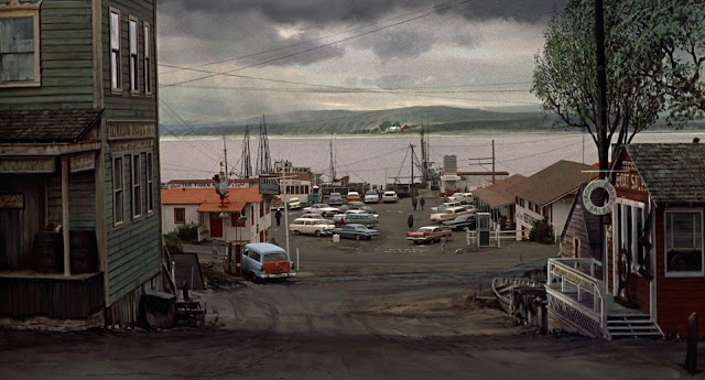 'Pictorial Designs by Albert Whitlock'for Alfred Hitchcock's THE BIRDS (1963) for which he painted some 13 mattes. THE BIRDS sealed Al's creative cache with Hitchcock, who would use Albert's services on all of his subsequent pictures. The pair hit it off without question, both being Londoners and of a similar background, not to mention a very junior Whitlock having worked on 3 or 4 of Hitch's very early British films.