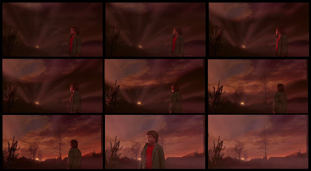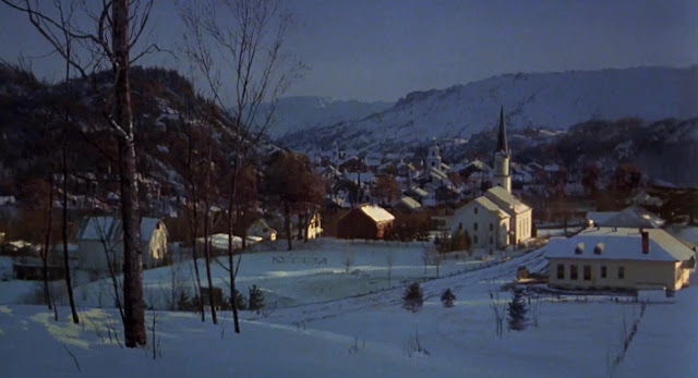 Jim outlined his glass shot as follows: “It's from the Columbia TV movie It Came Upon The Midnight Clear. It's a cathedral of sorts. I comped it via rear projection. It has double-exposed oscillating 'heavenly rays' generated via rotating slit gags. There was also a traveling matte I used to lighten the faces of the actors lined up at the heavenly gates (necessary because the DP ordered the haze blown out of the stage before I arrived on set. Without the haze, the lighting was too contrasty”. It’s a great shot and I appreciate Jim sending me the frame.